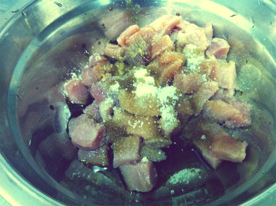 1) DICE PORK TO 1.5CM CUBES, AND MARINATE FOR 15MINS IN FRIDGE.
